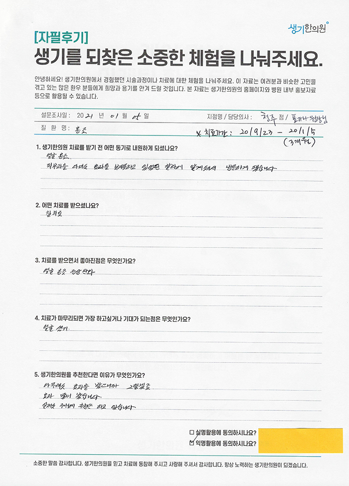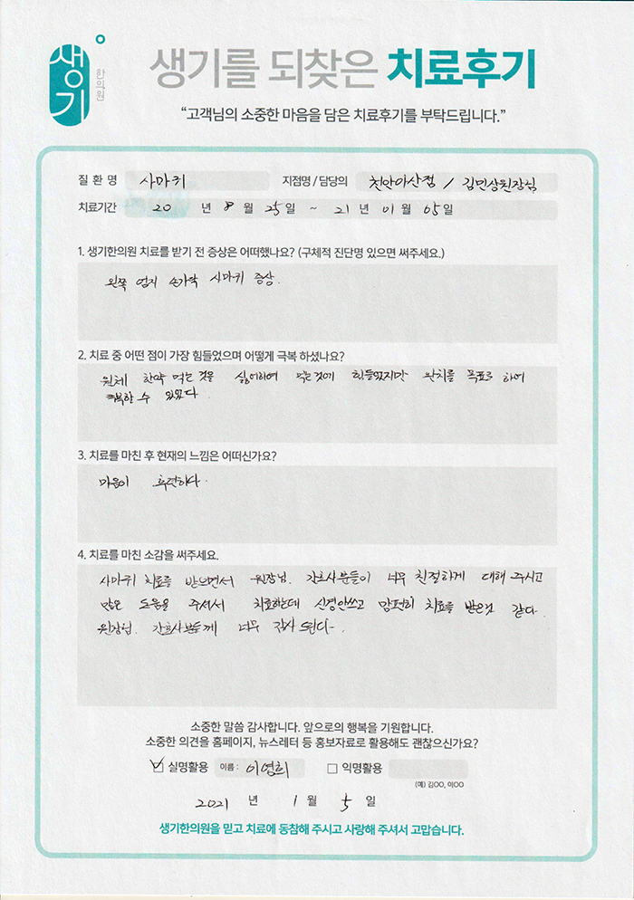 생기한의원과 함께하신 생생한 자필 및 영상 후기를 소개합니다.