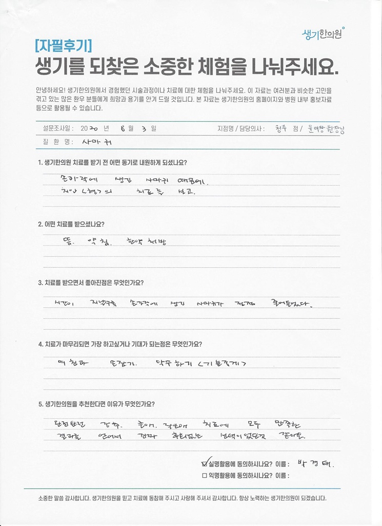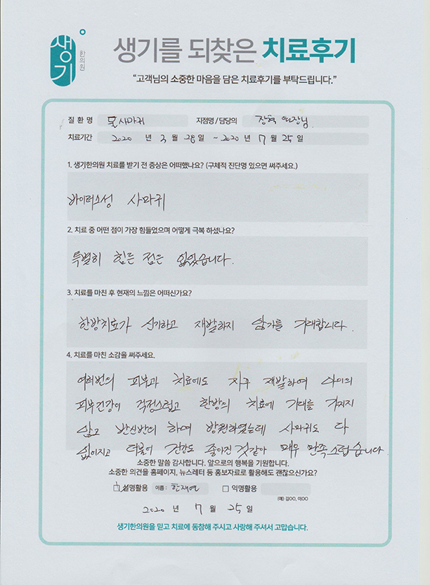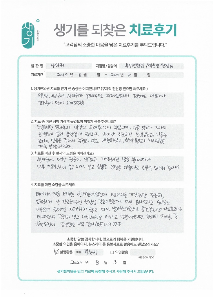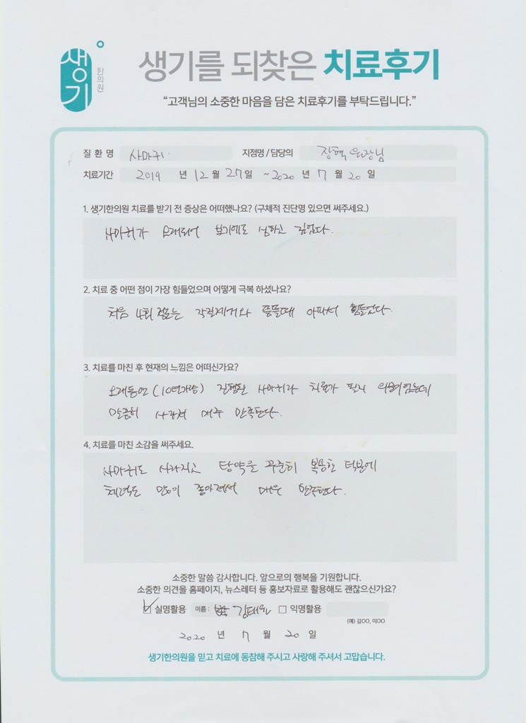 생기한의원과 함께하신 생생한 자필 및 영상 후기를 소개합니다.