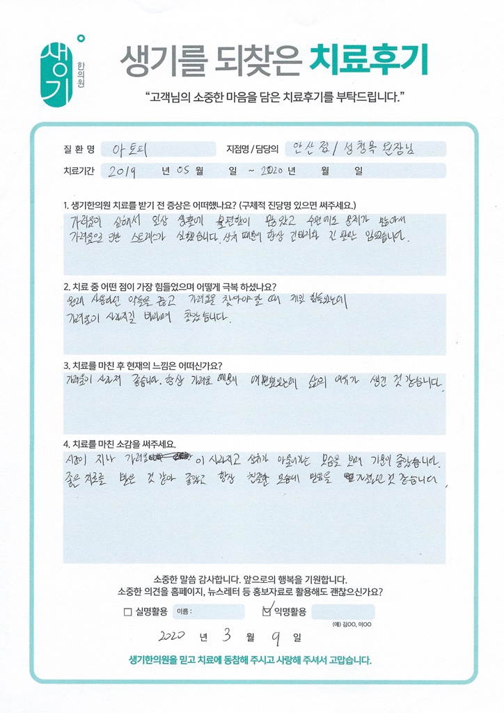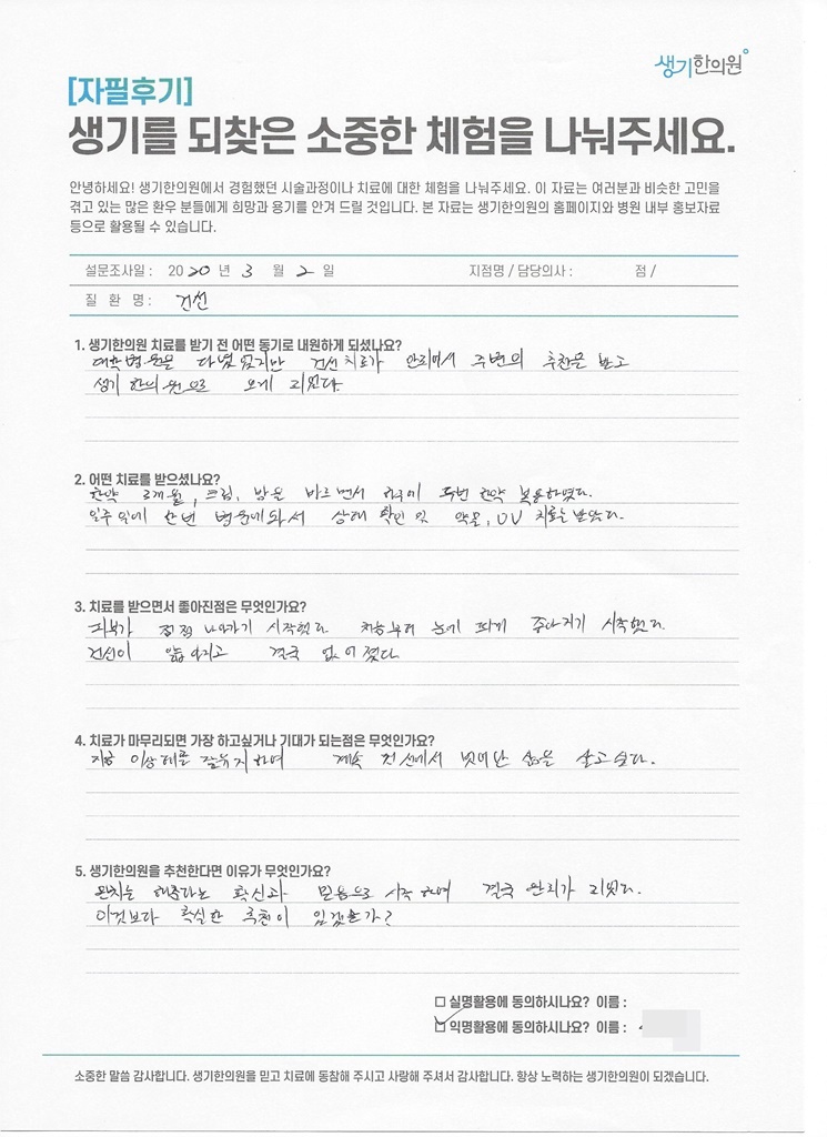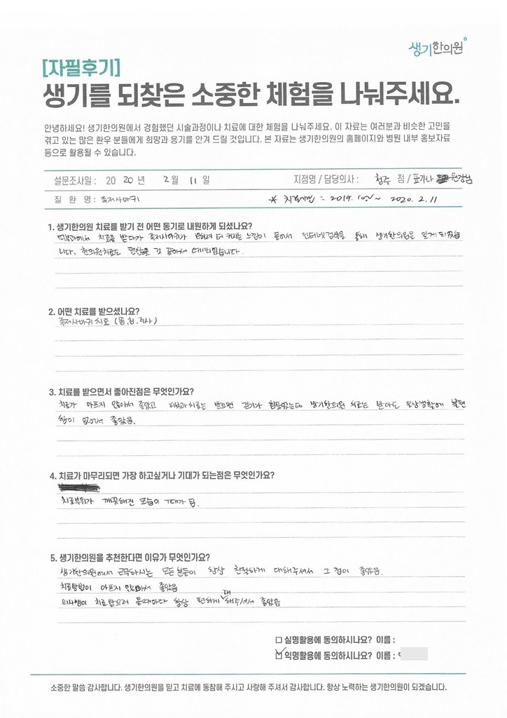 생기한의원과 함께하신 생생한 자필 및 영상 후기를 소개합니다.