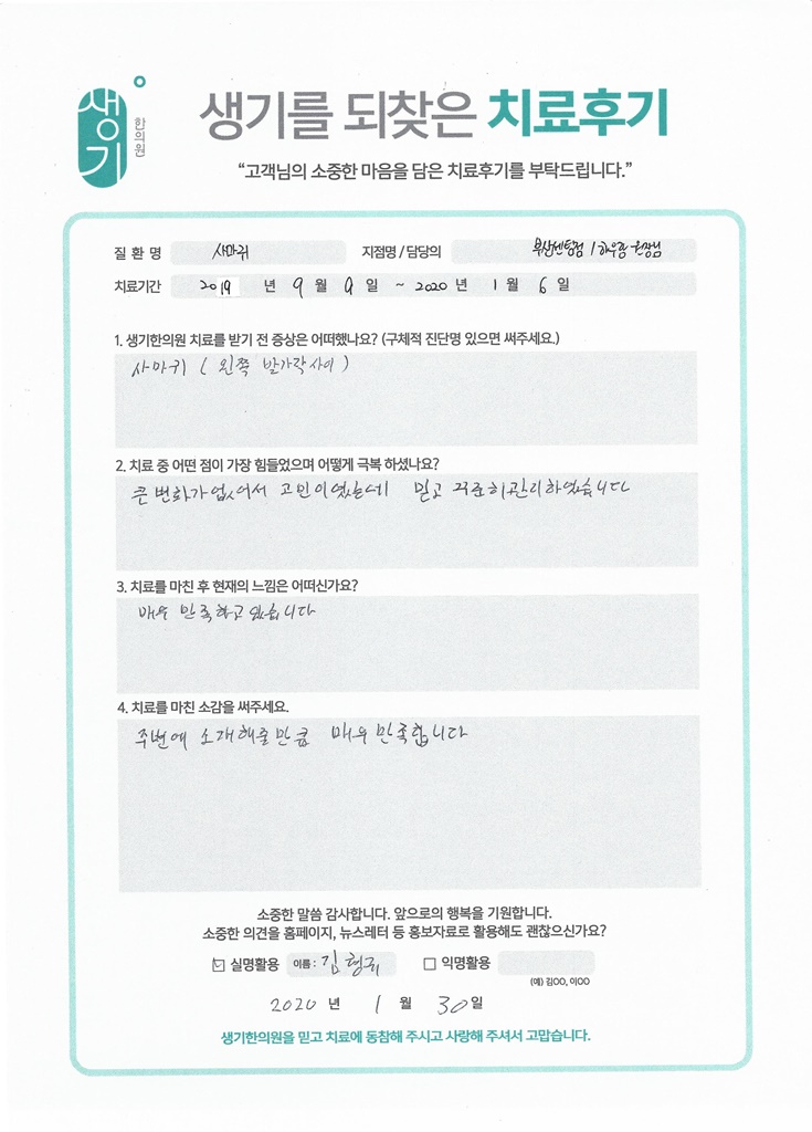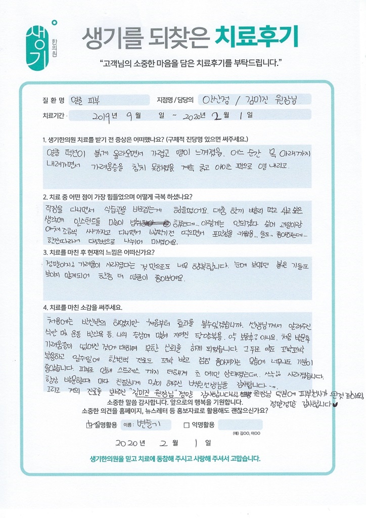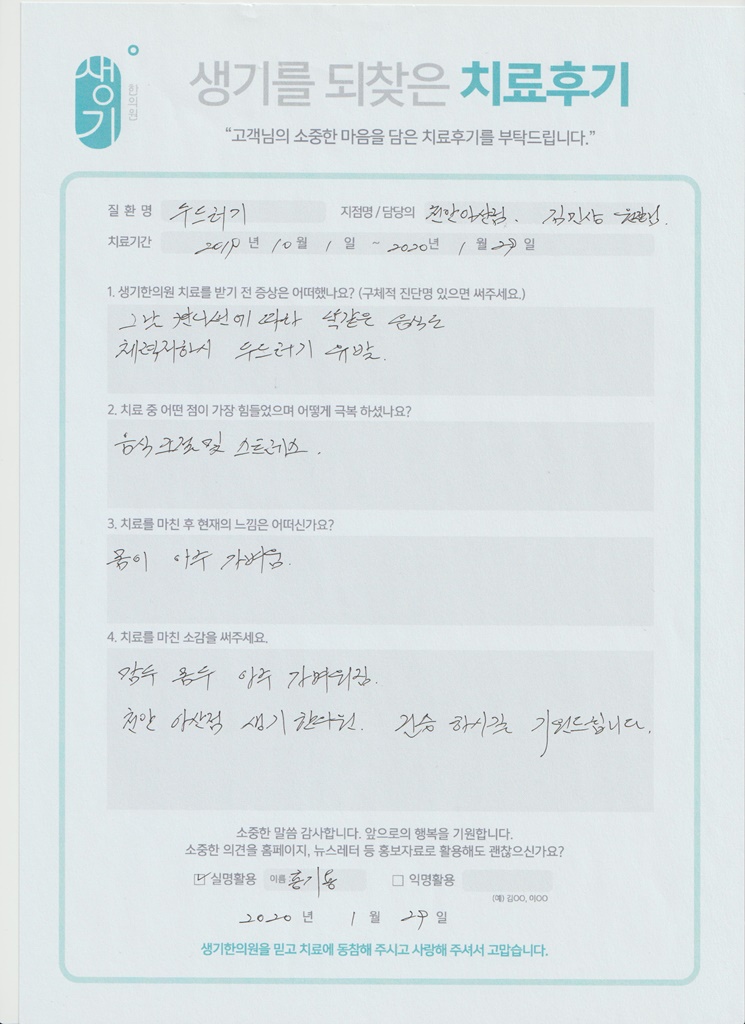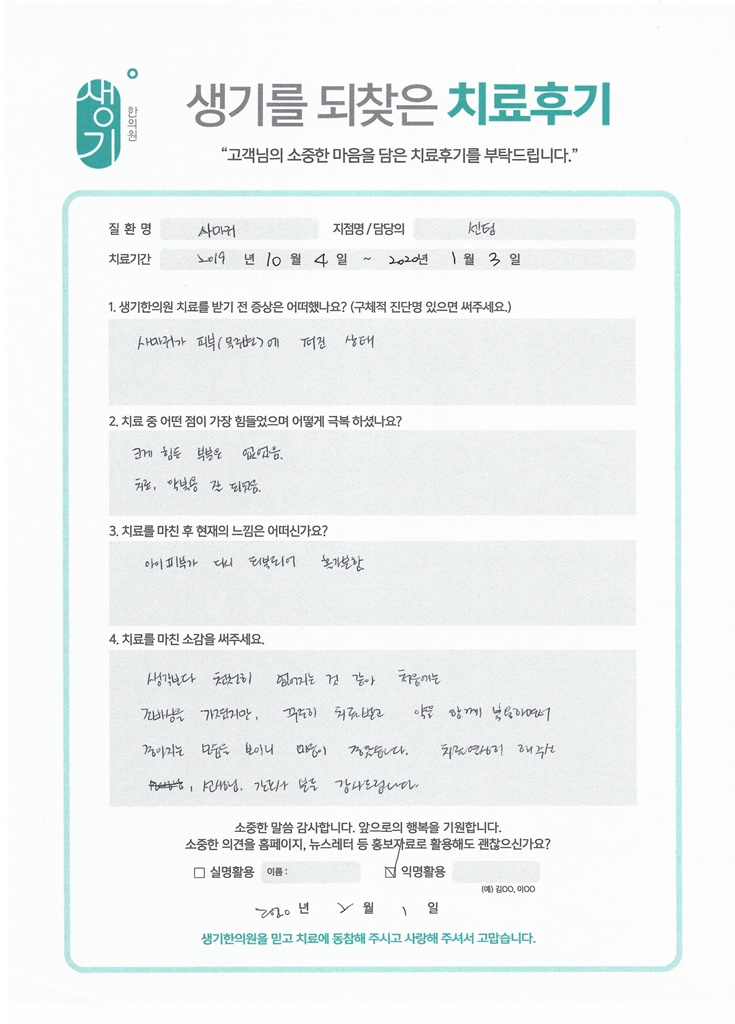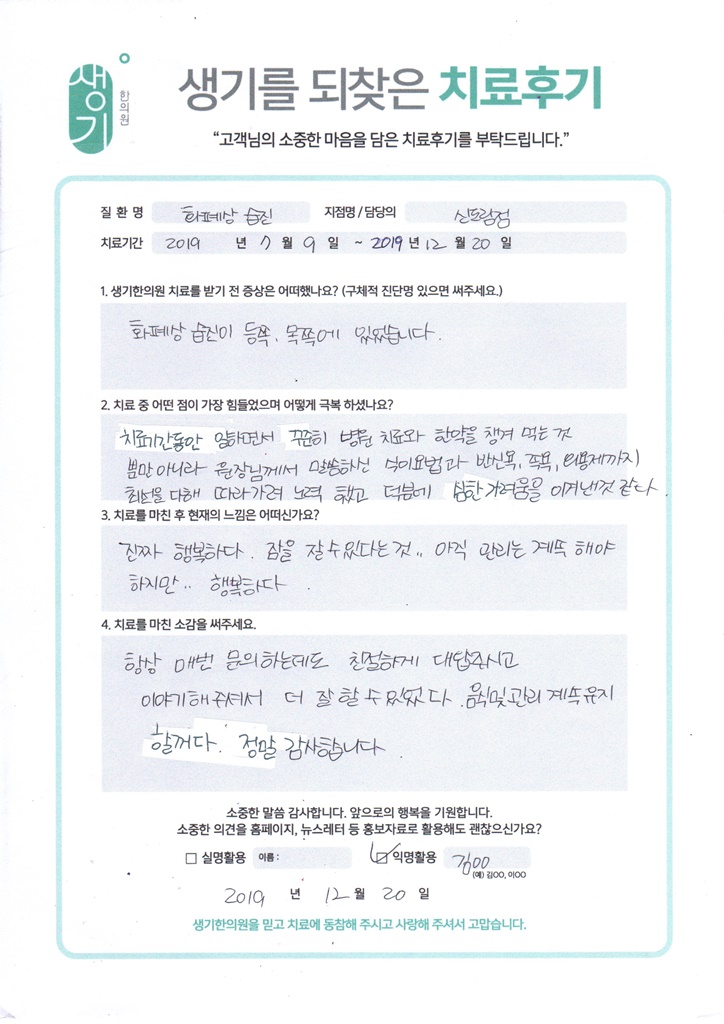 생기한의원과 함께하신 생생한 자필 및 영상 후기를 소개합니다.