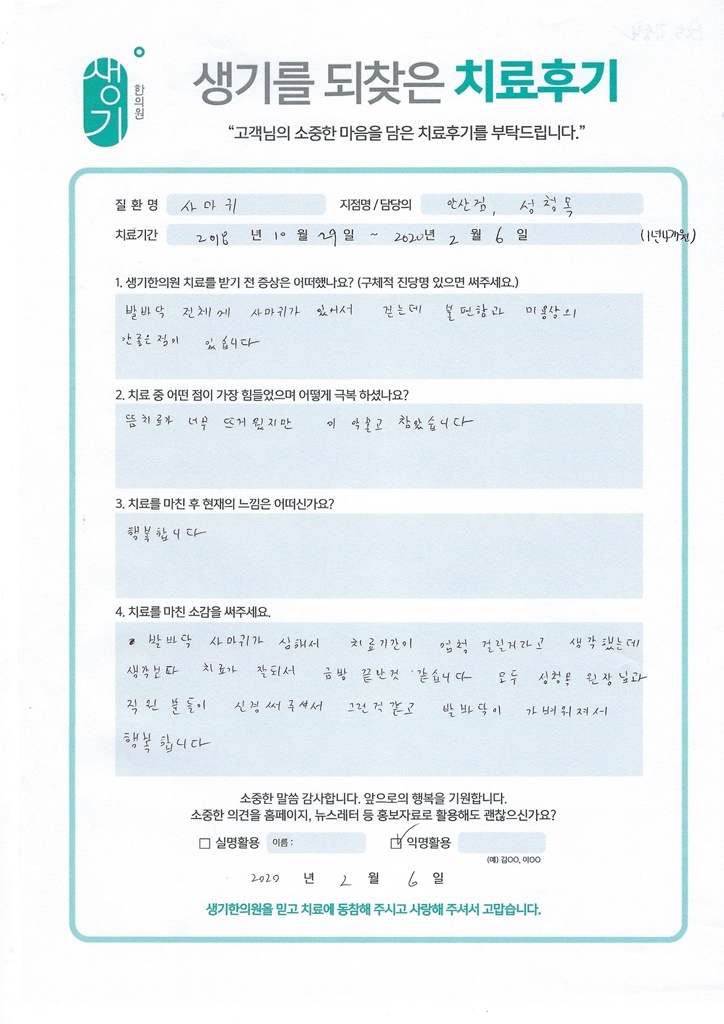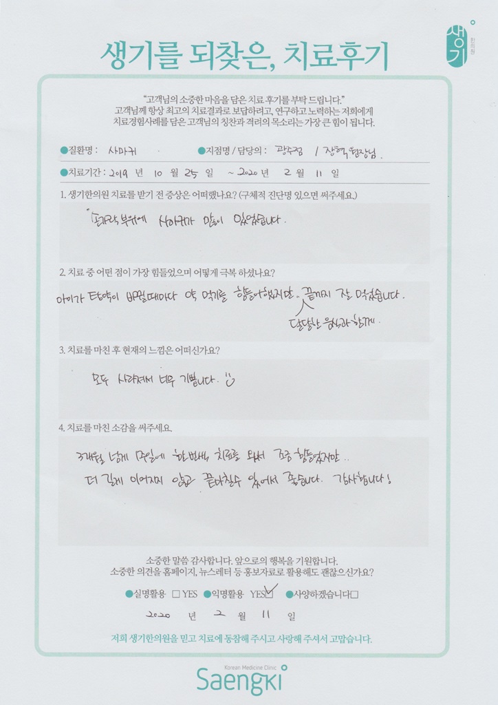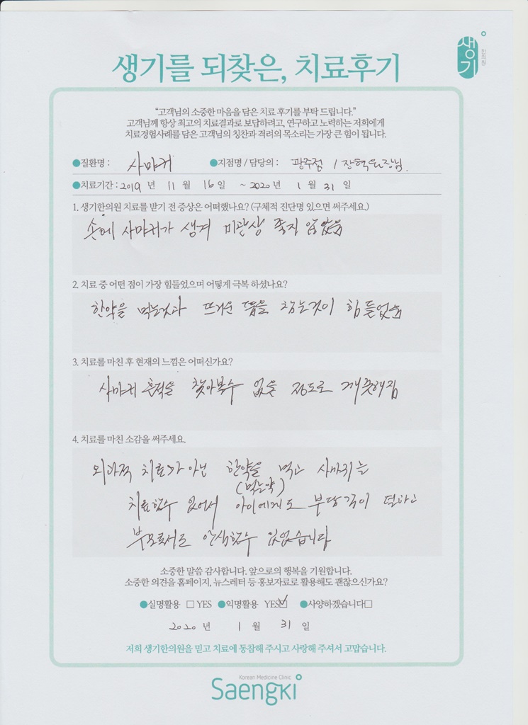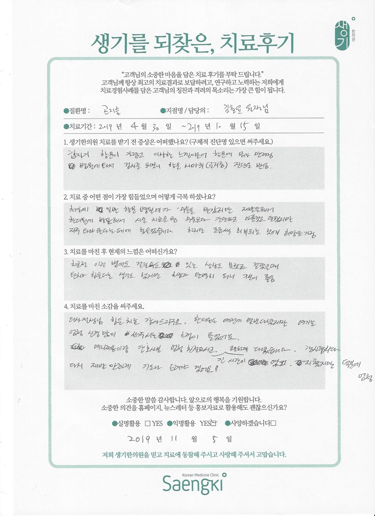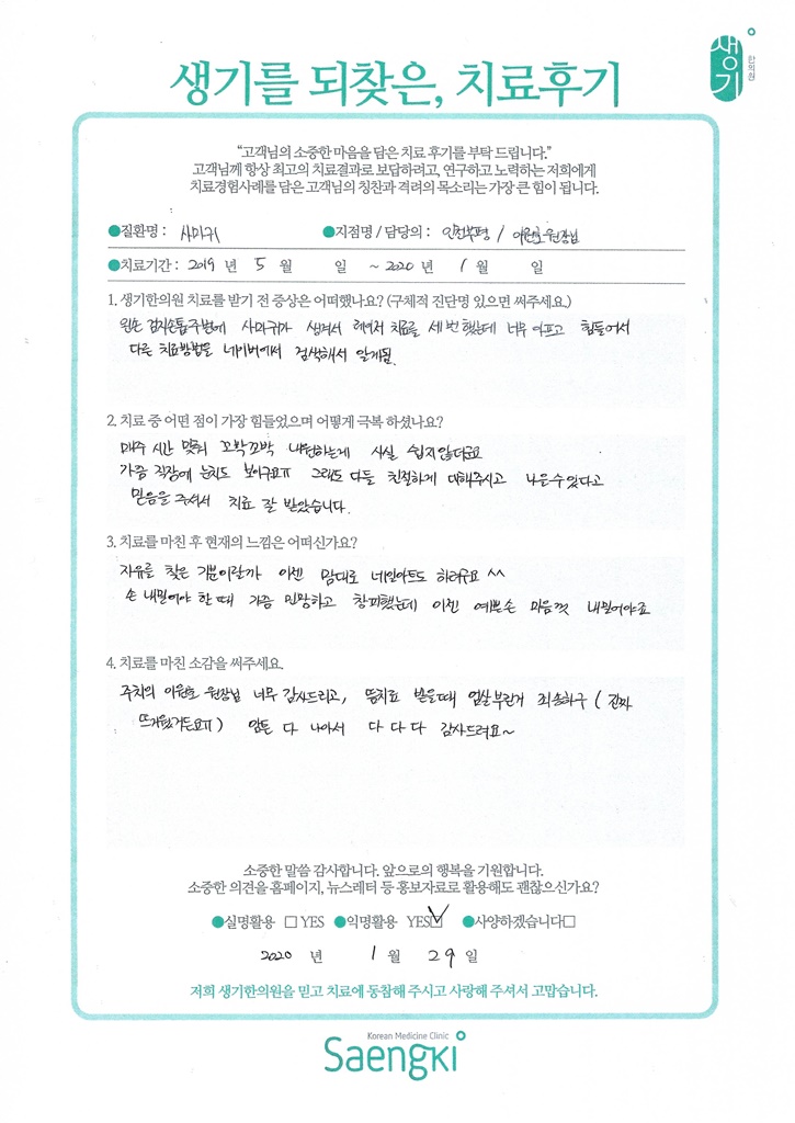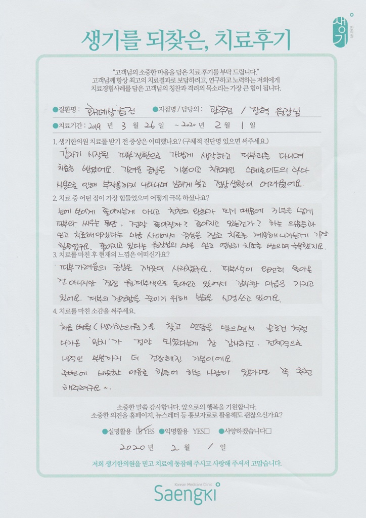 생기한의원과 함께하신 생생한 자필 및 영상 후기를 소개합니다.