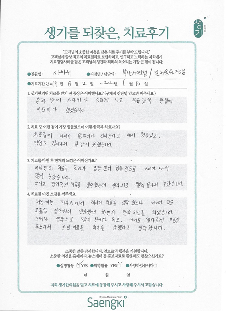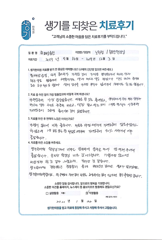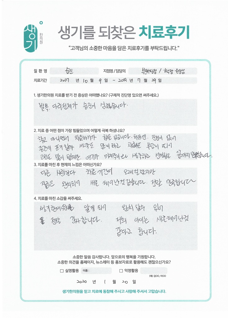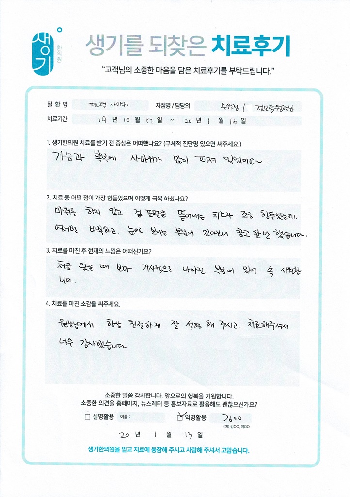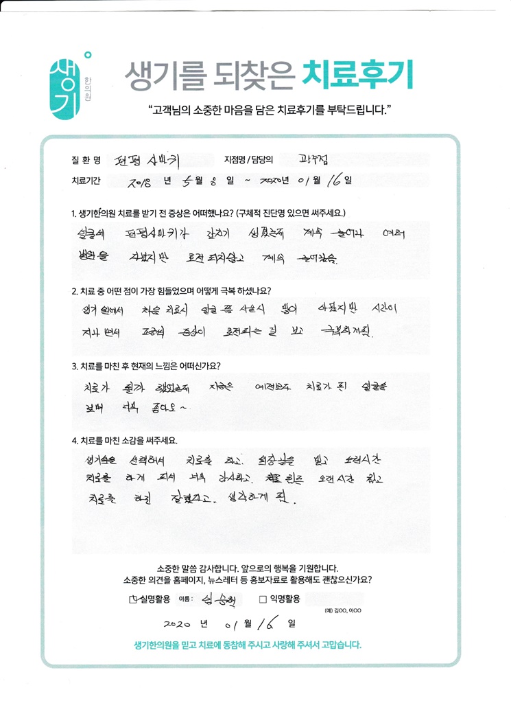생기한의원과 함께하신 생생한 자필 및 영상 후기를 소개합니다.