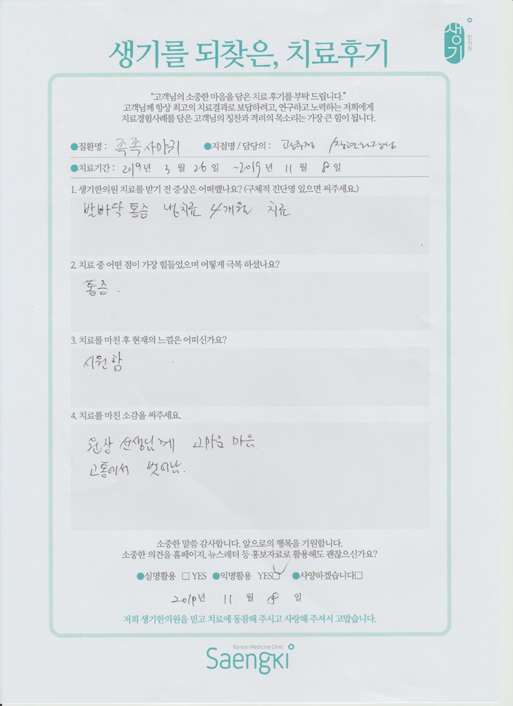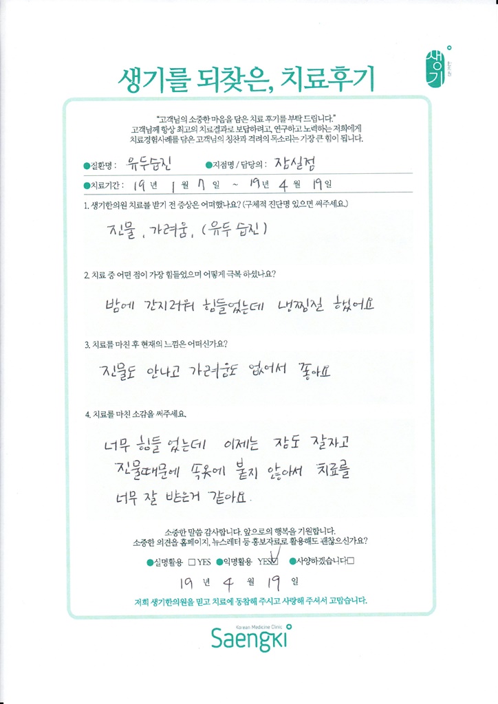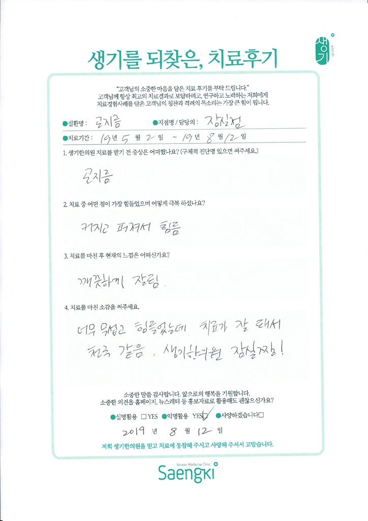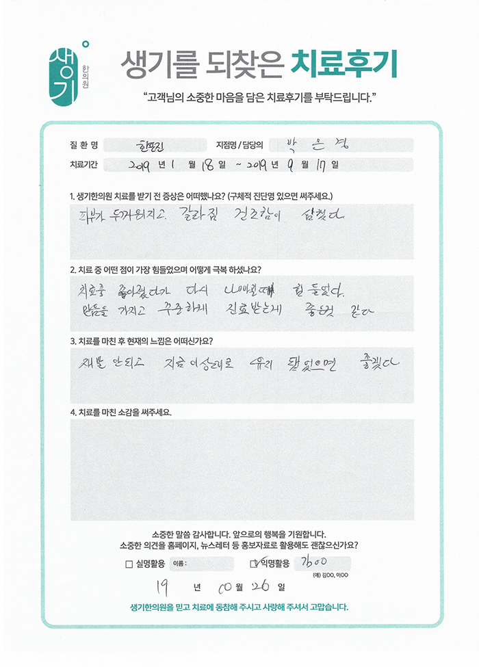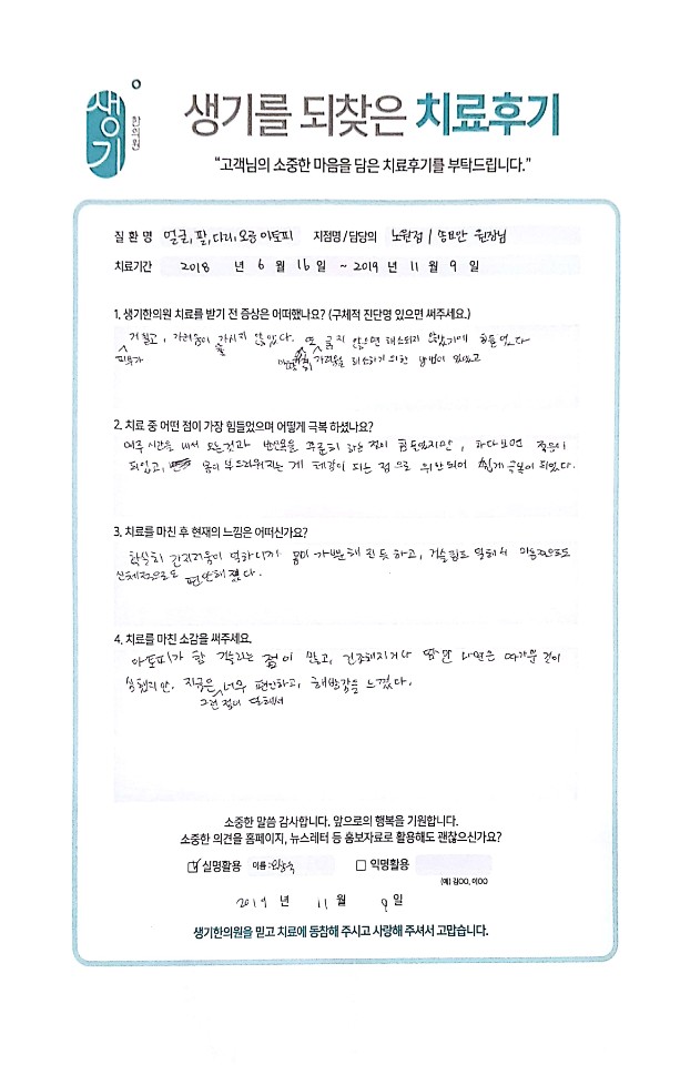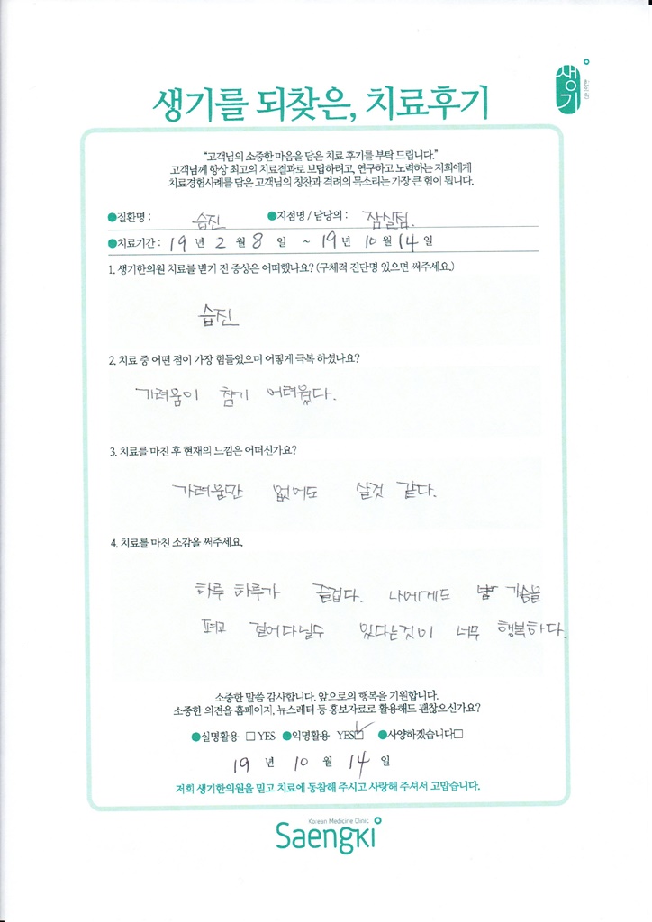 생기한의원과 함께하신 생생한 자필 및 영상 후기를 소개합니다.