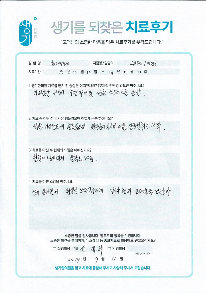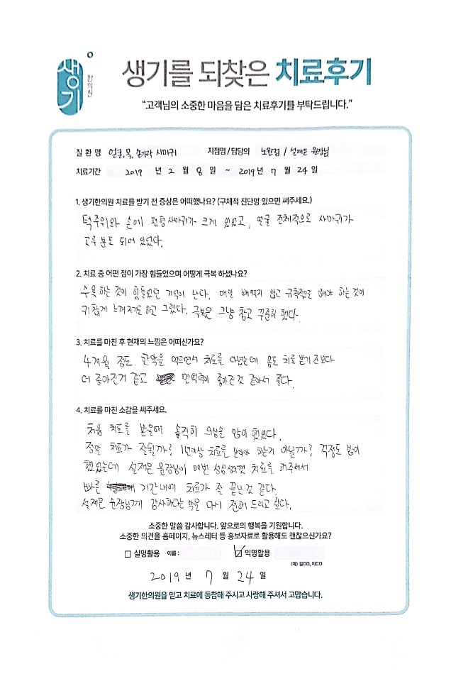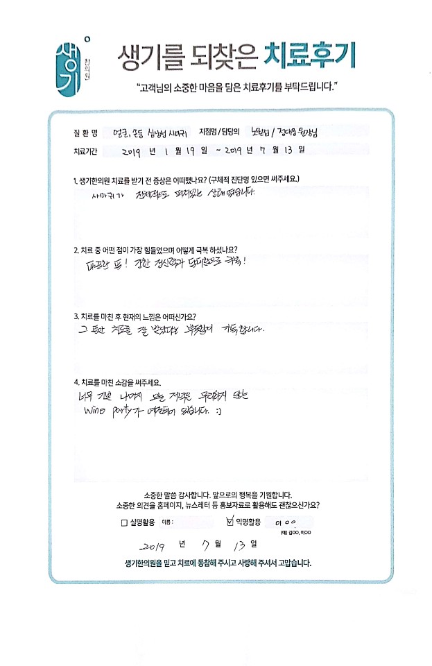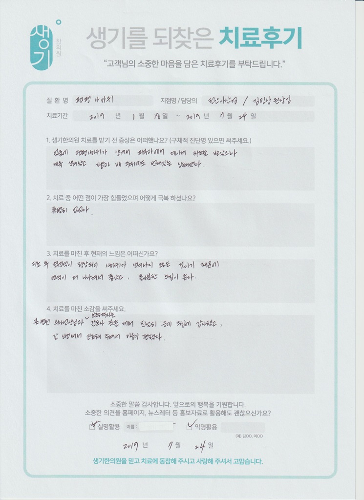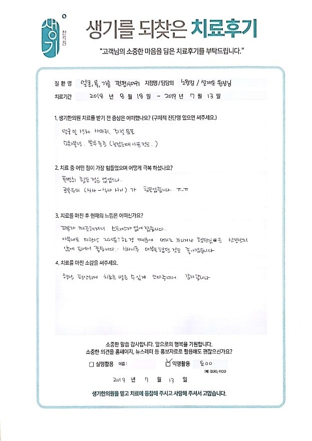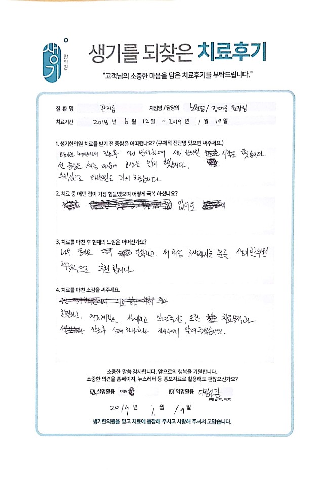 생기한의원과 함께하신 생생한 자필 및 영상 후기를 소개합니다.