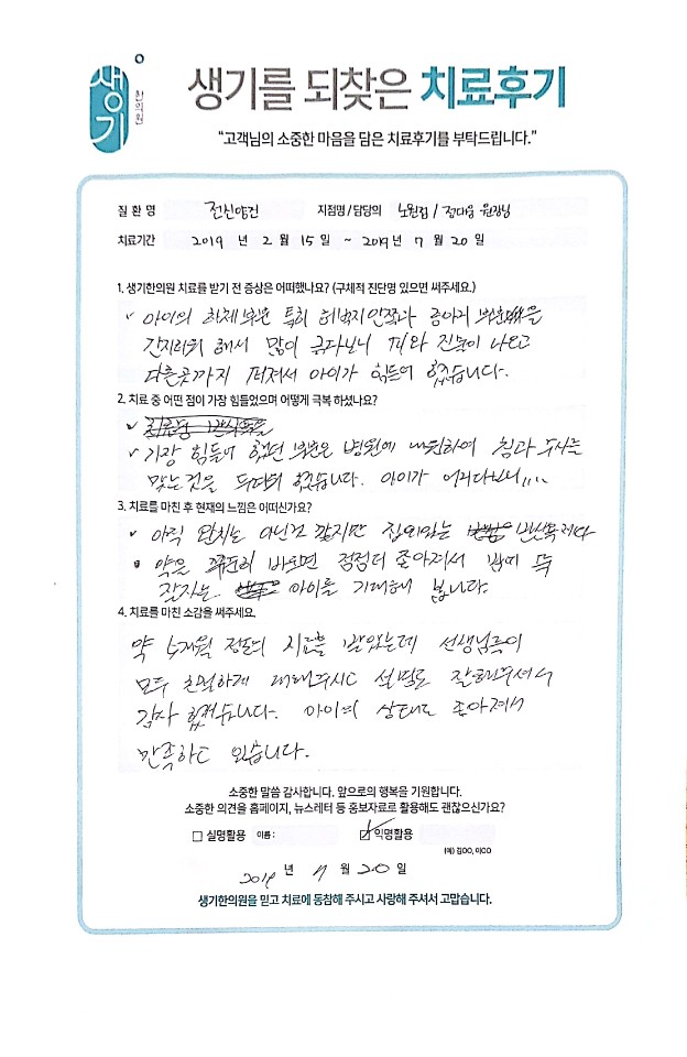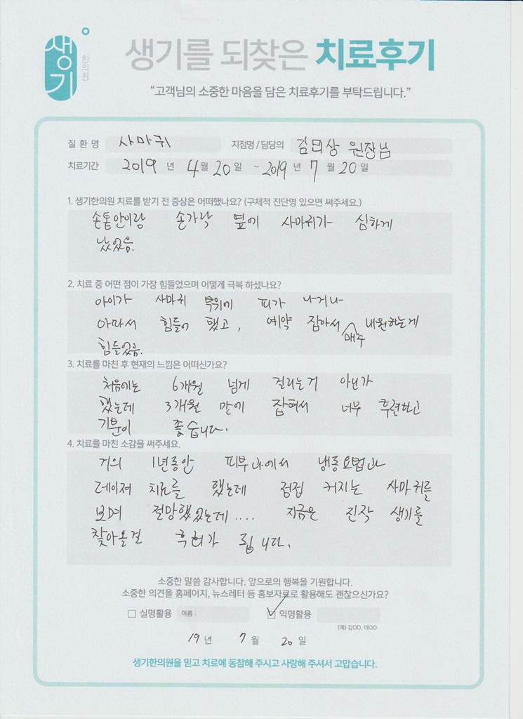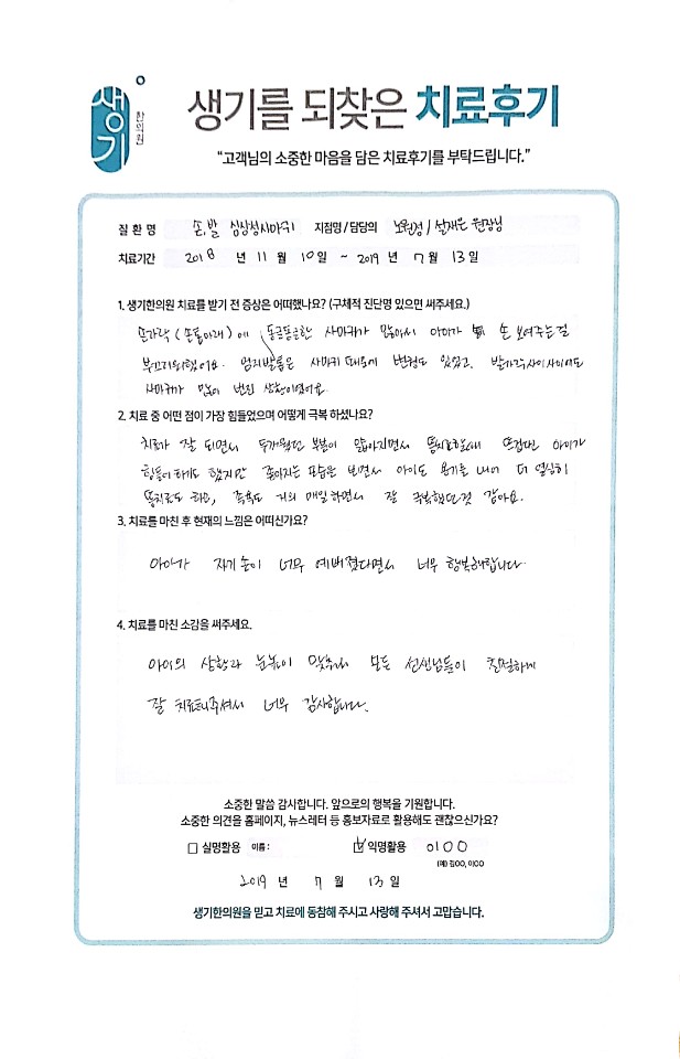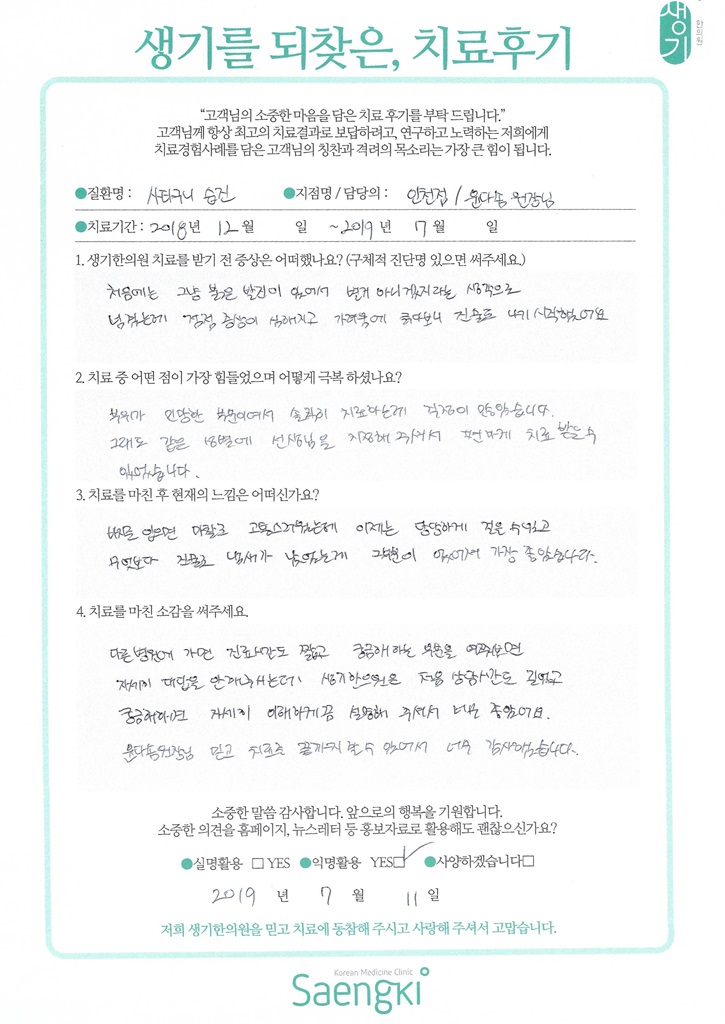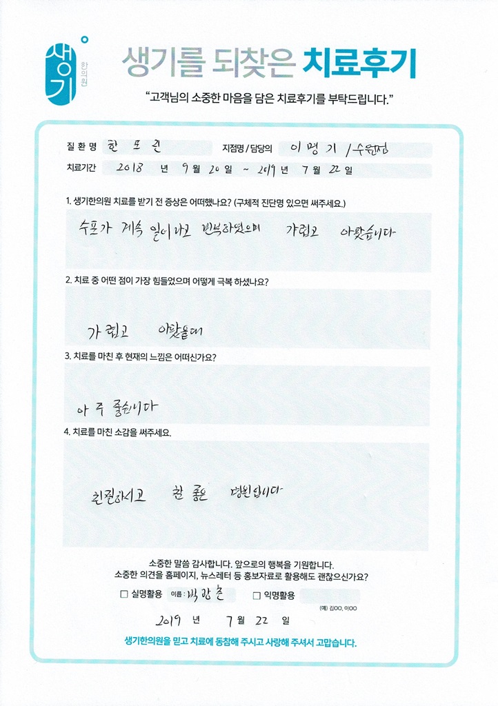 생기한의원과 함께하신 생생한 자필 및 영상 후기를 소개합니다.