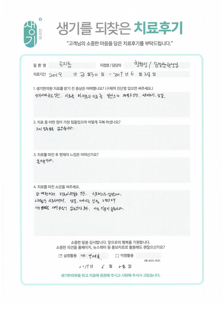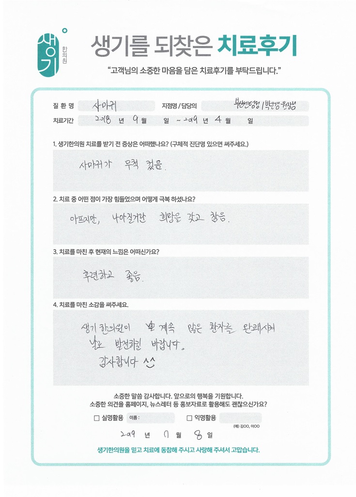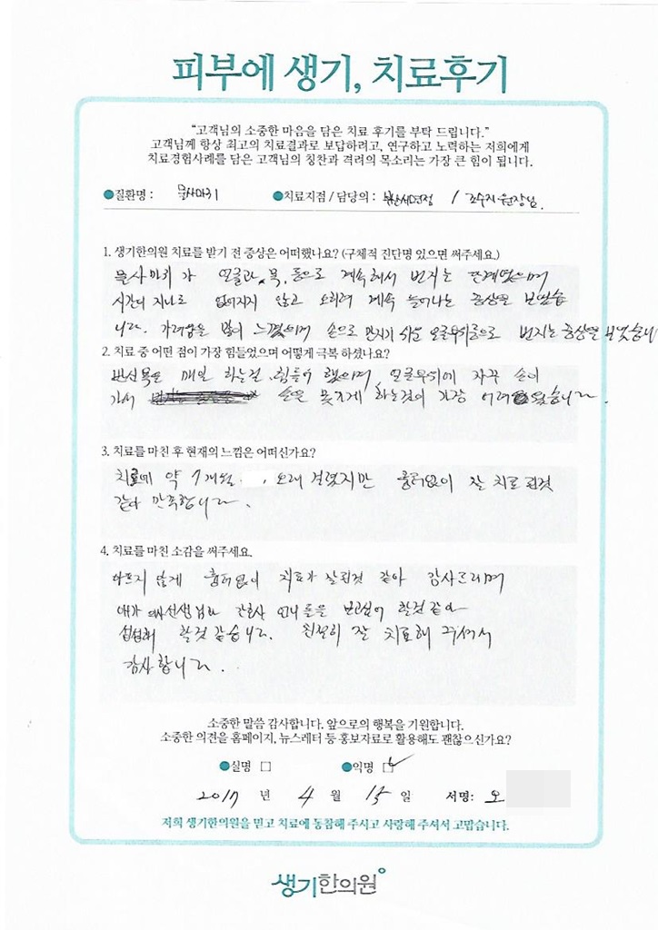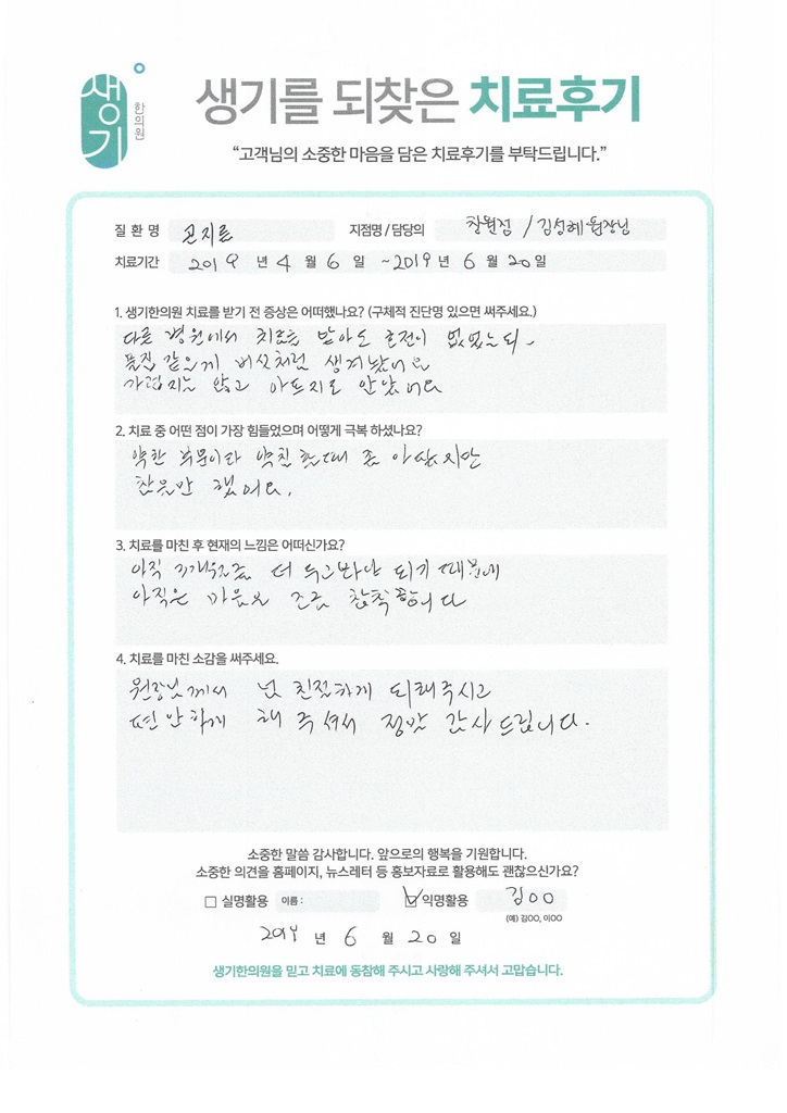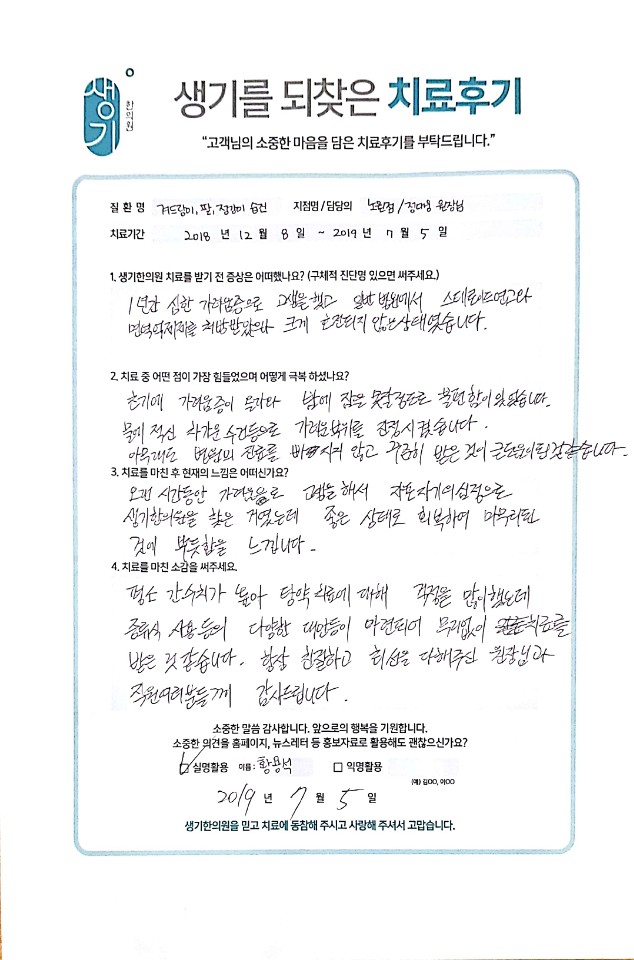 생기한의원과 함께하신 생생한 자필 및 영상 후기를 소개합니다.