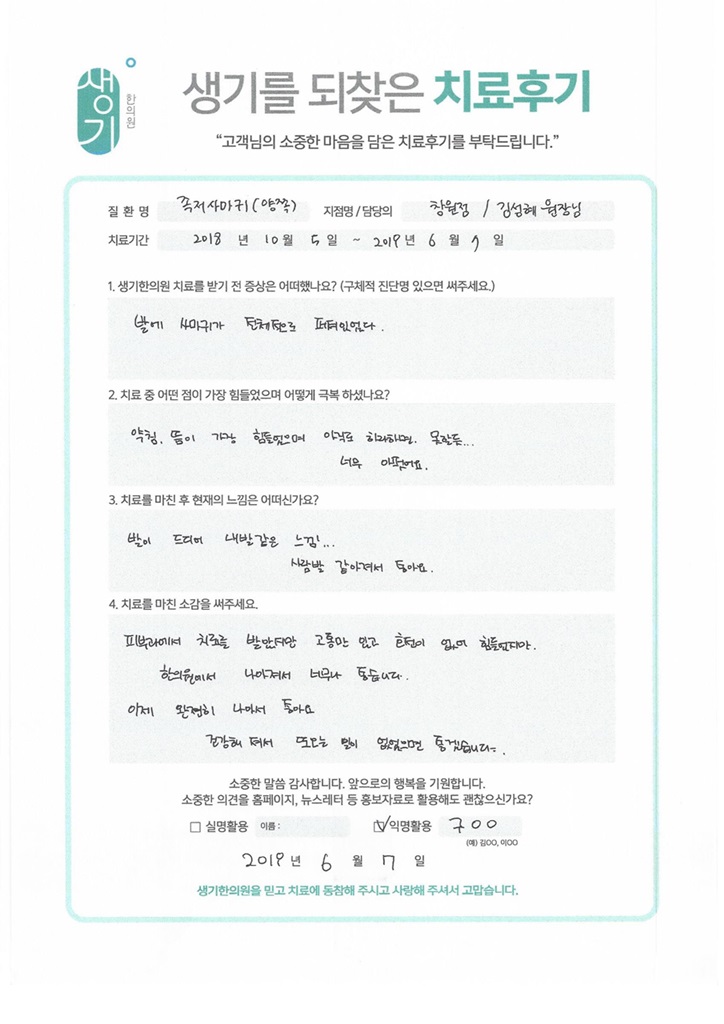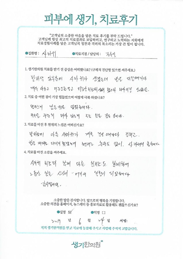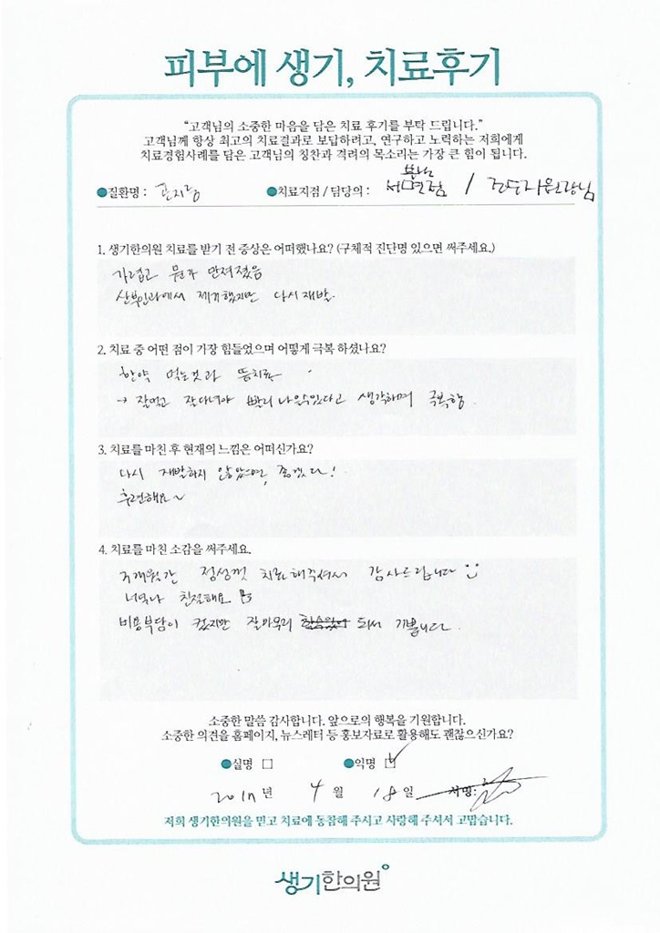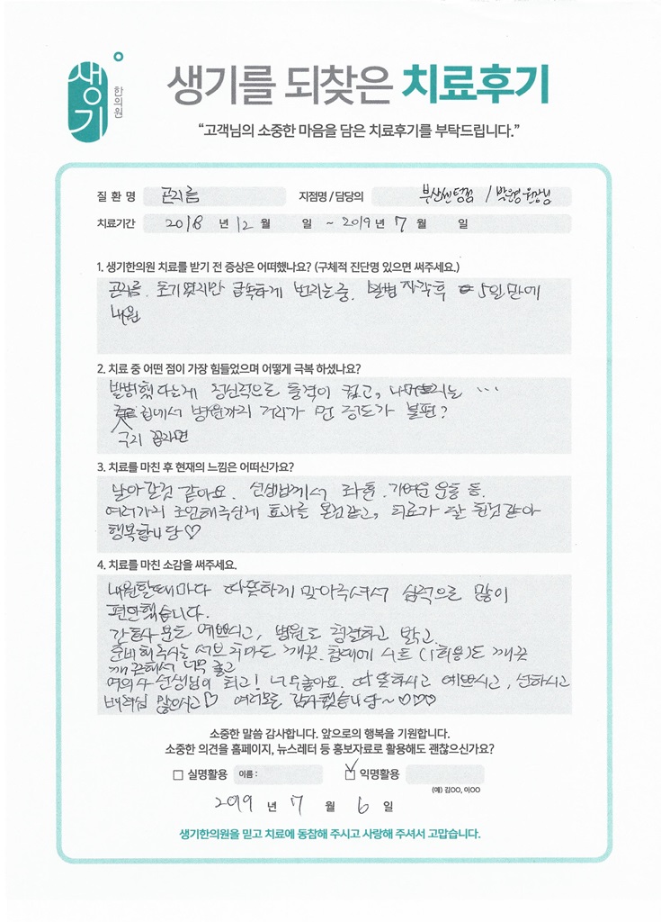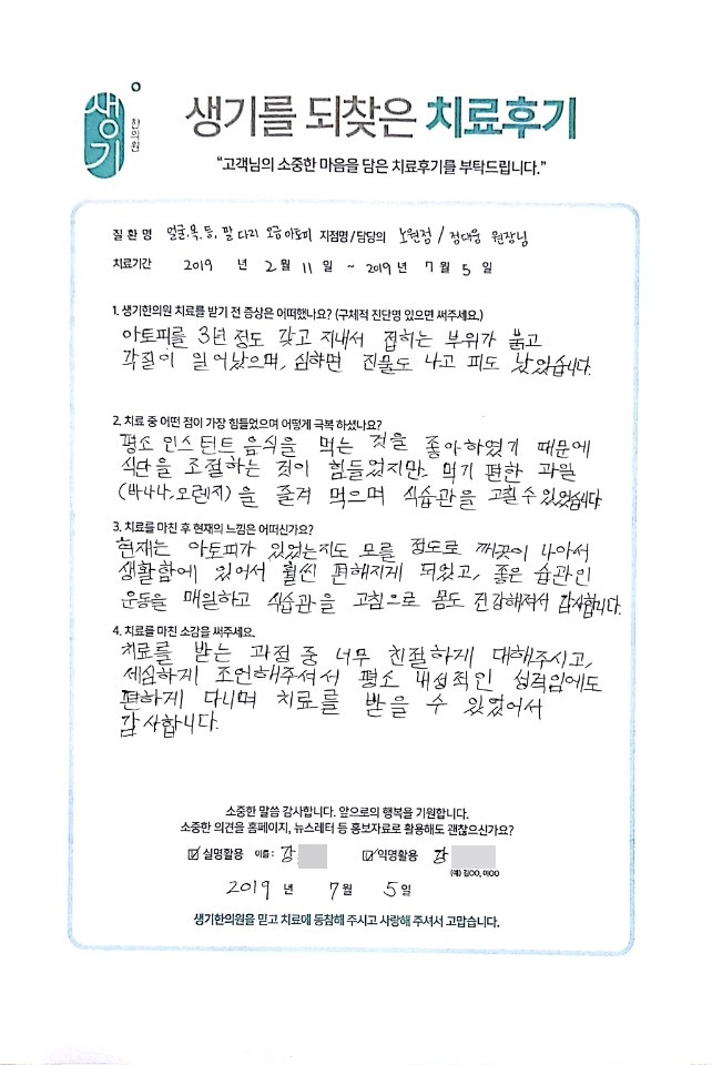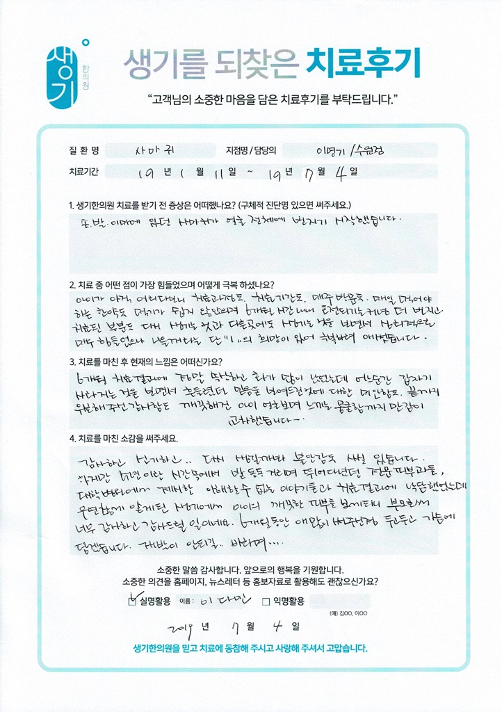 생기한의원과 함께하신 생생한 자필 및 영상 후기를 소개합니다.