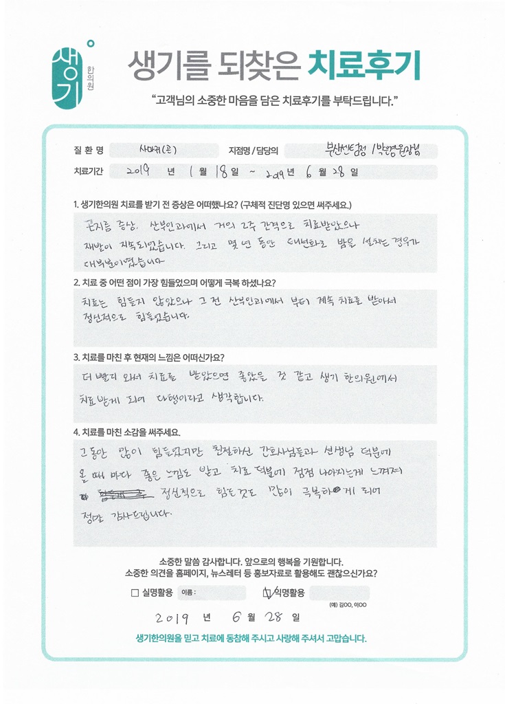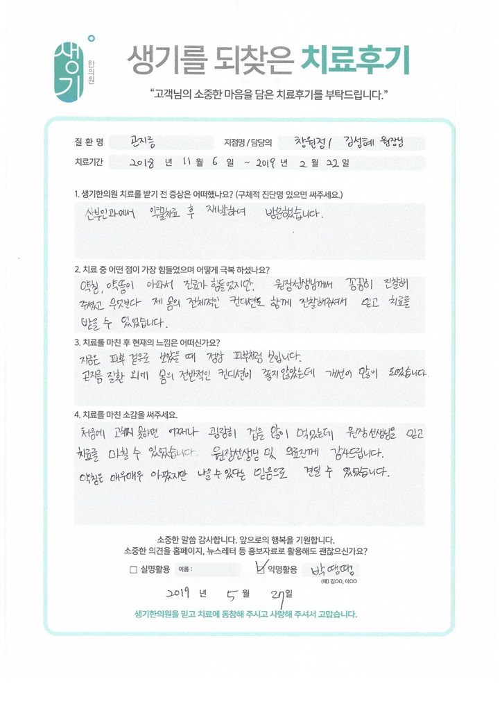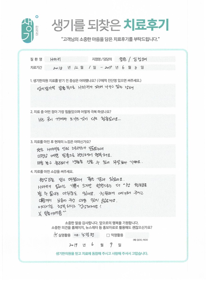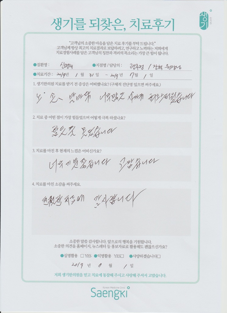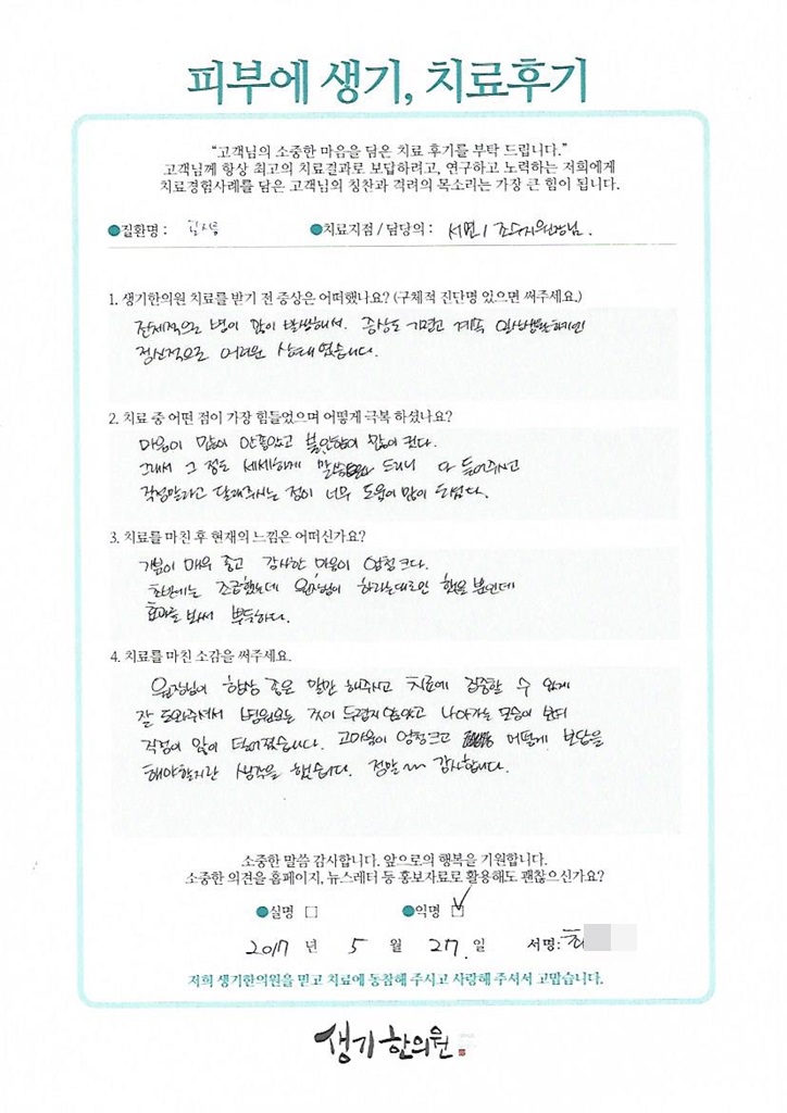 생기한의원과 함께하신 생생한 자필 및 영상 후기를 소개합니다.