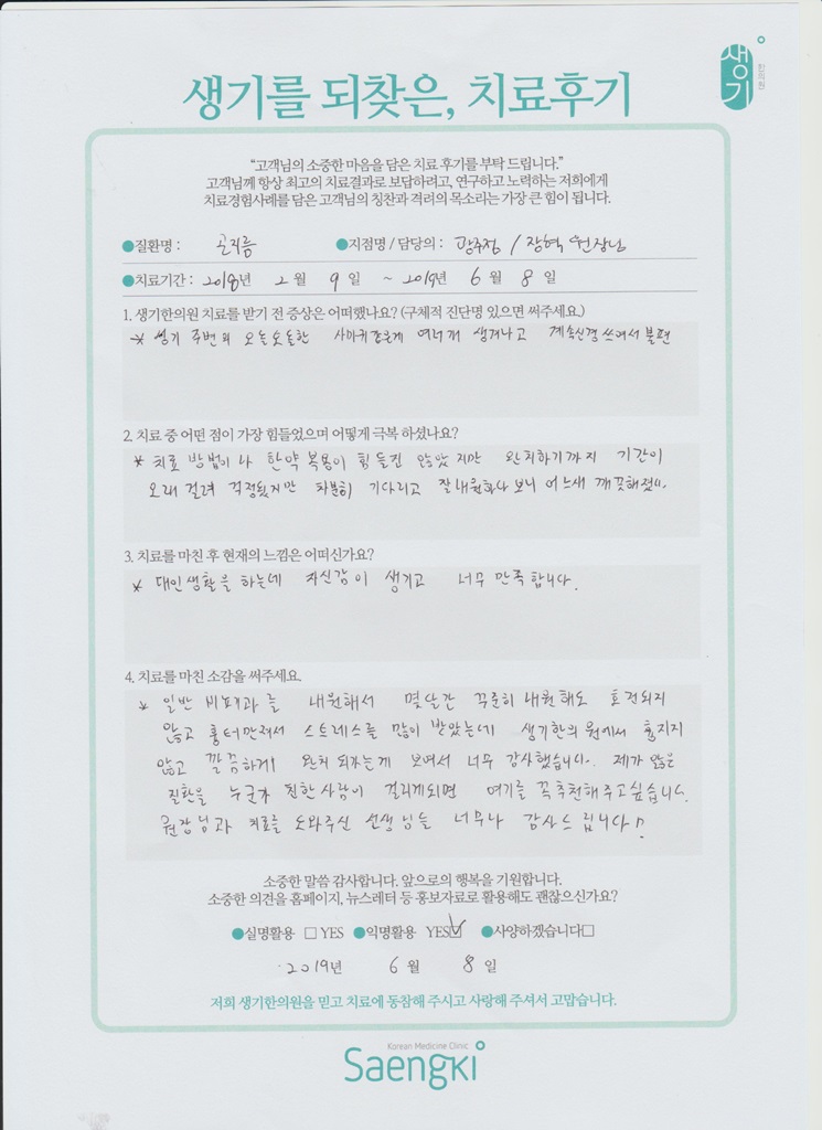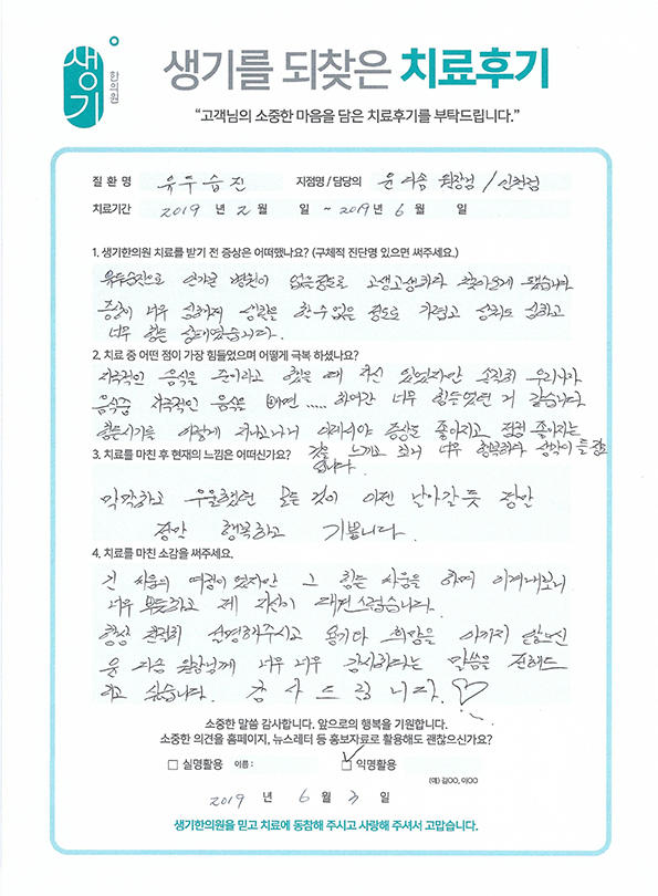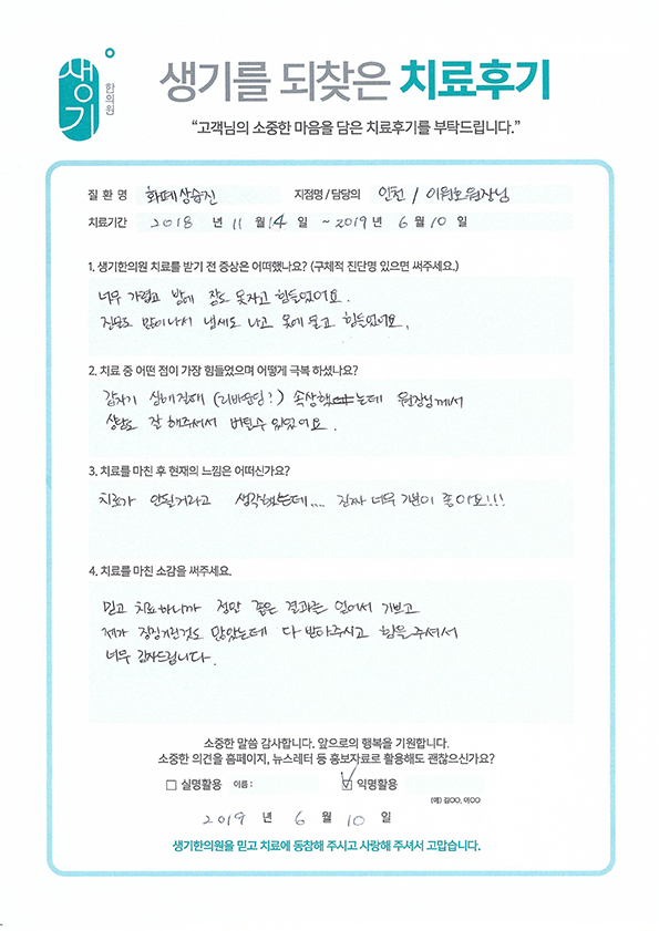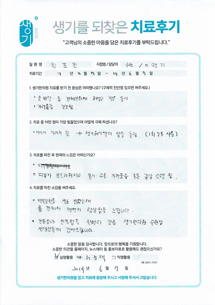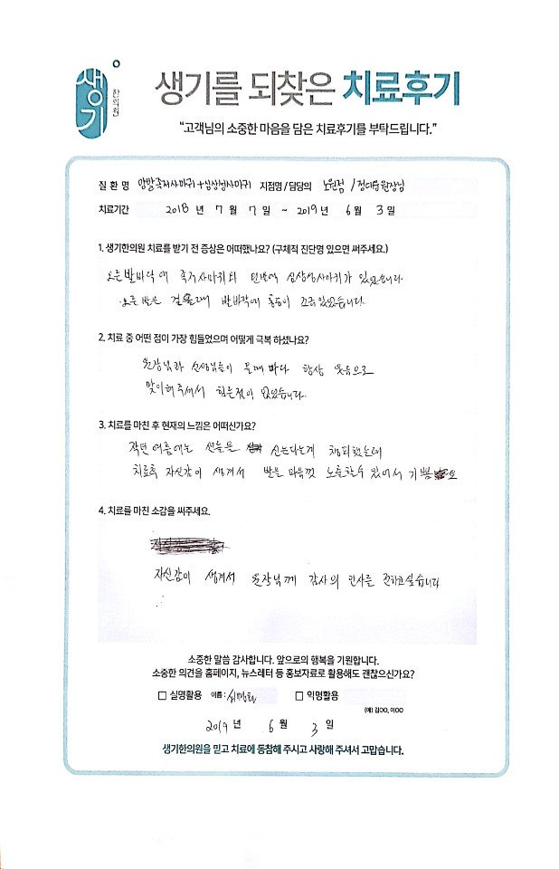 생기한의원과 함께하신 생생한 자필 및 영상 후기를 소개합니다.