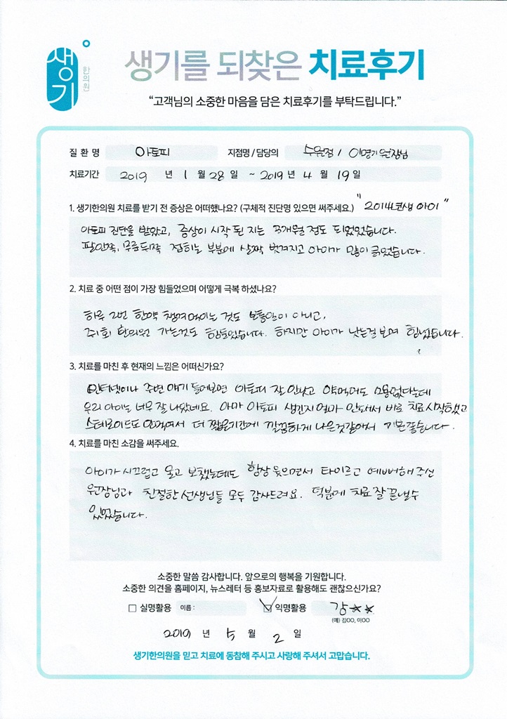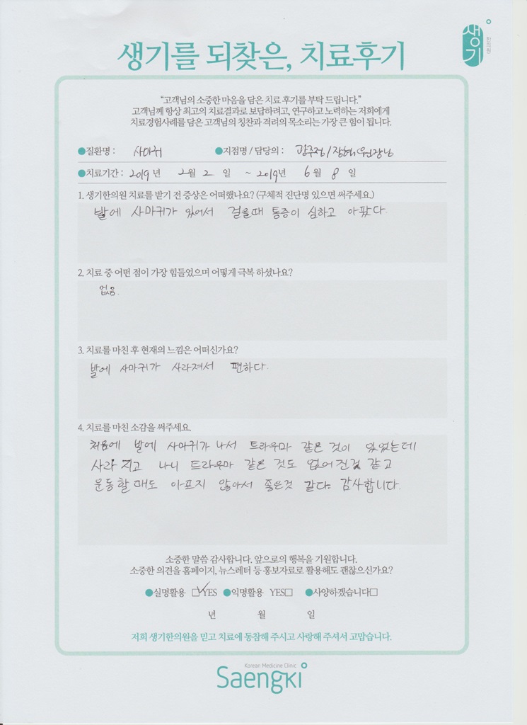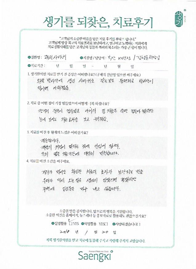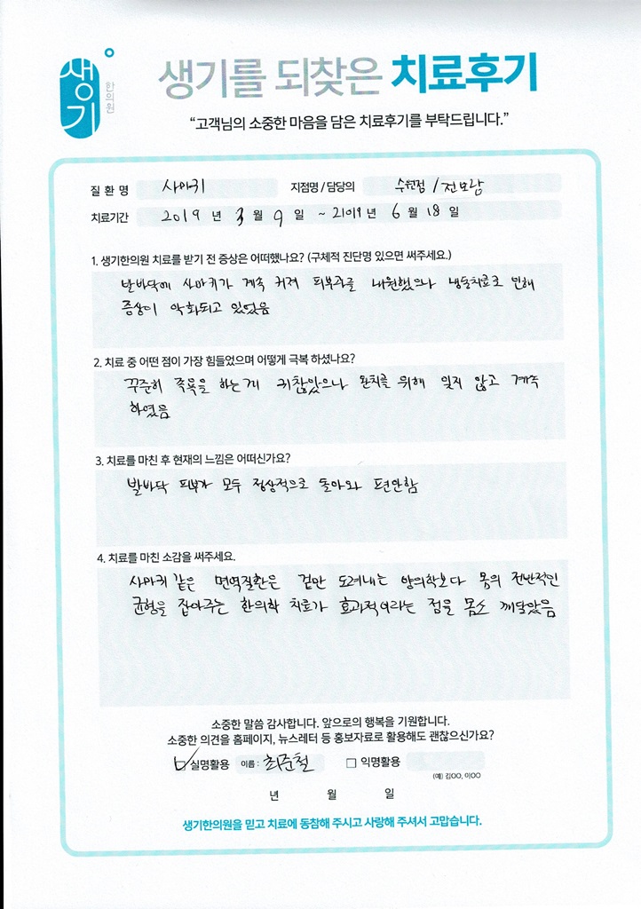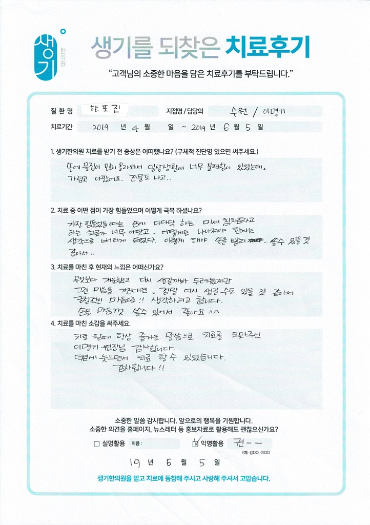 생기한의원과 함께하신 생생한 자필 및 영상 후기를 소개합니다.