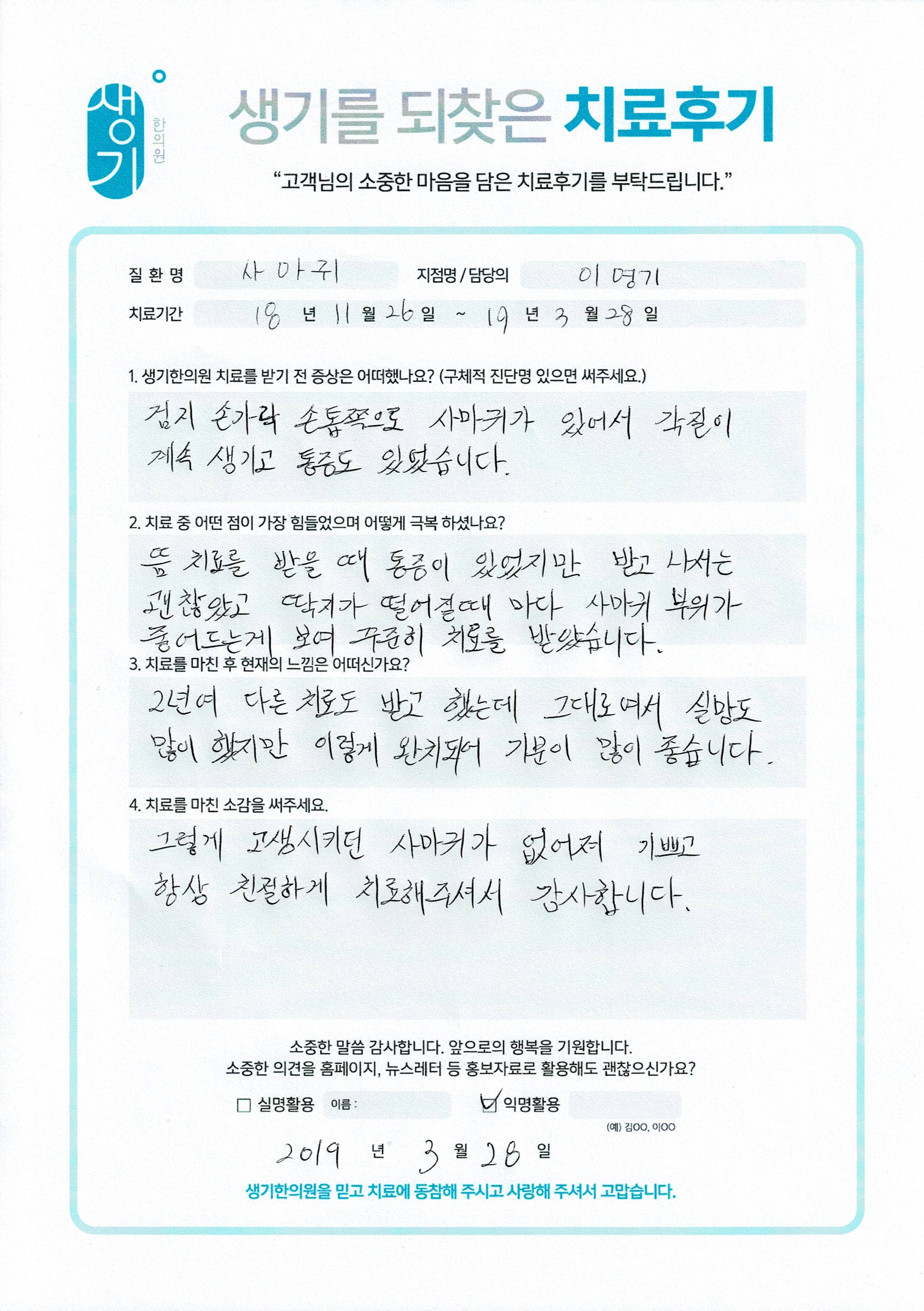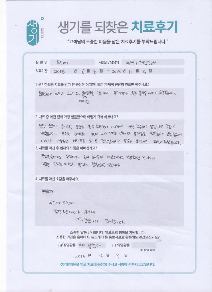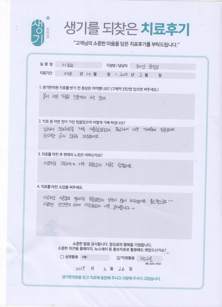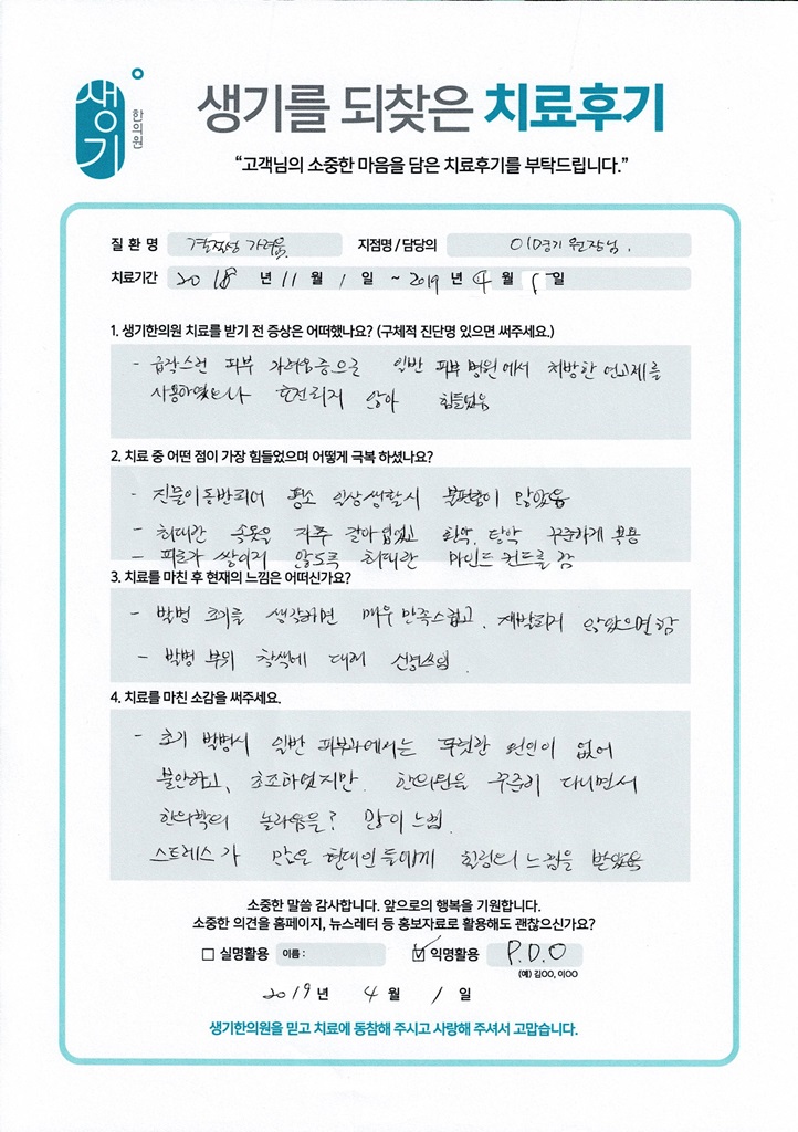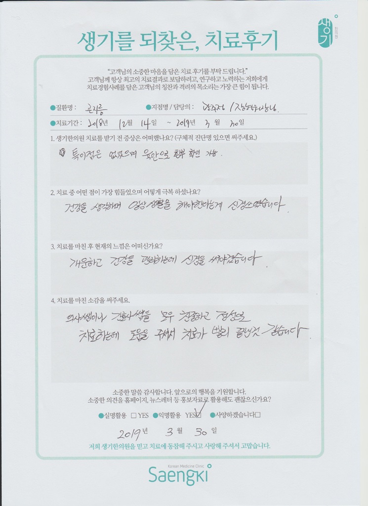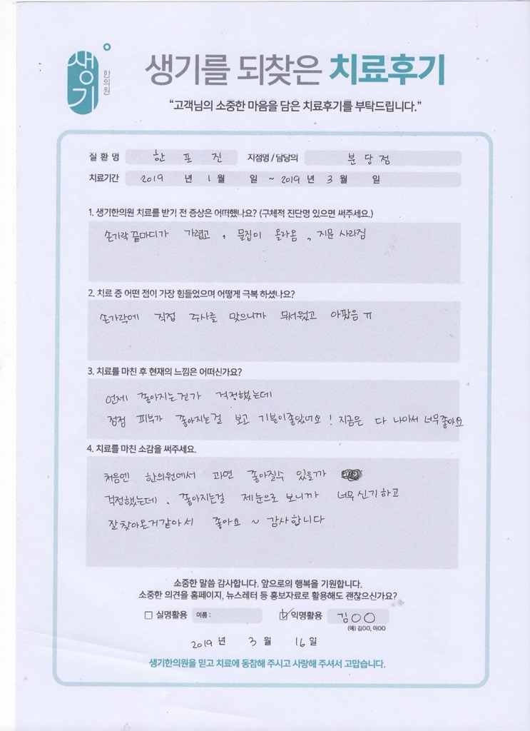 생기한의원과 함께하신 생생한 자필 및 영상 후기를 소개합니다.