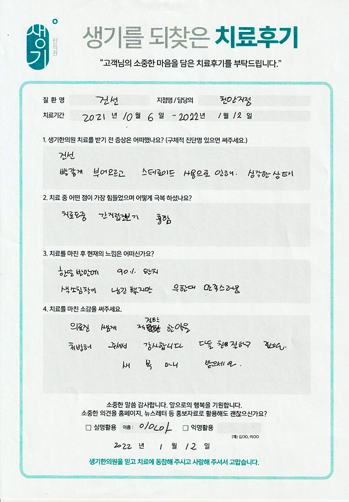 생기한의원과 함께하신 생생한 자필 및 영상 후기를 소개합니다.