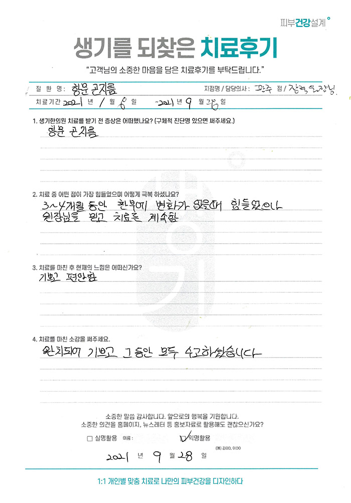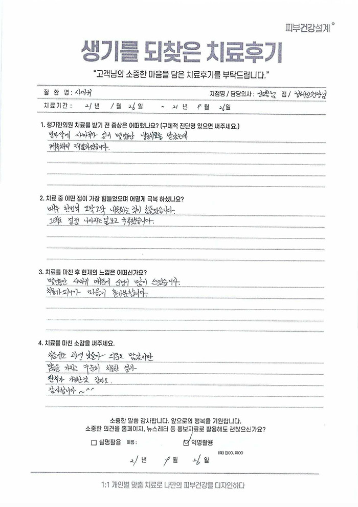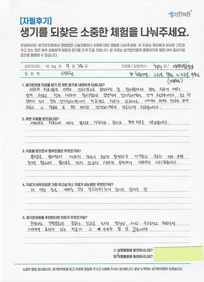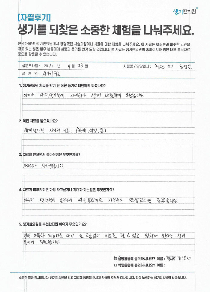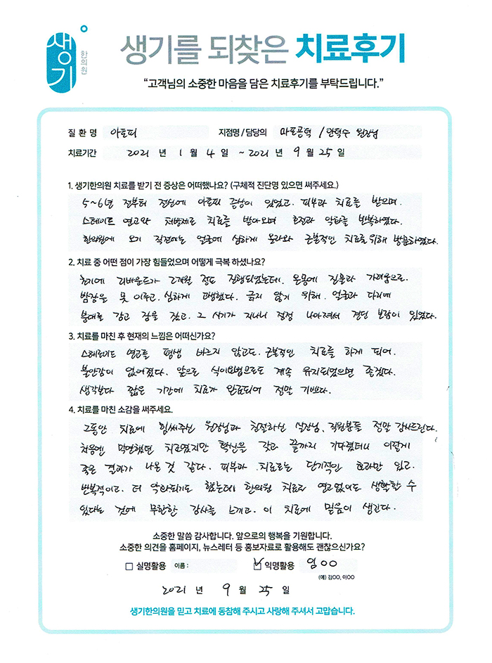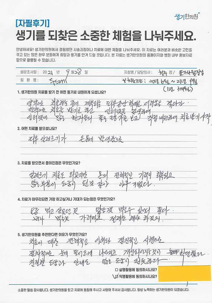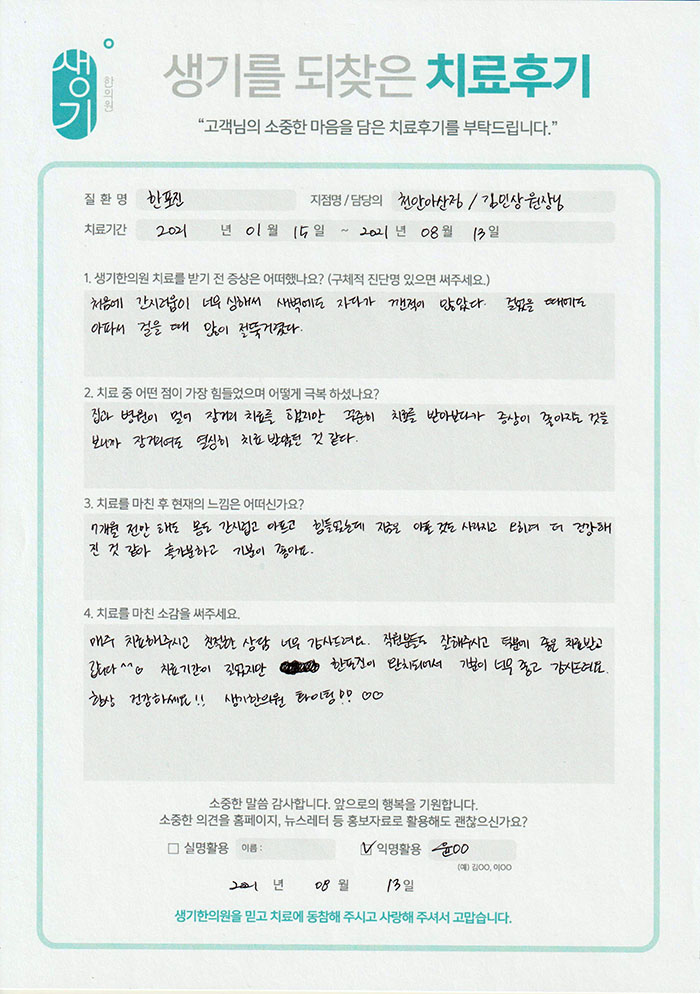 생기한의원과 함께하신 생생한 자필 및 영상 후기를 소개합니다.