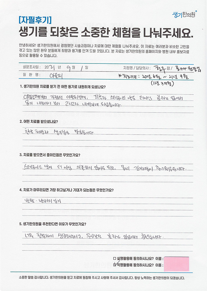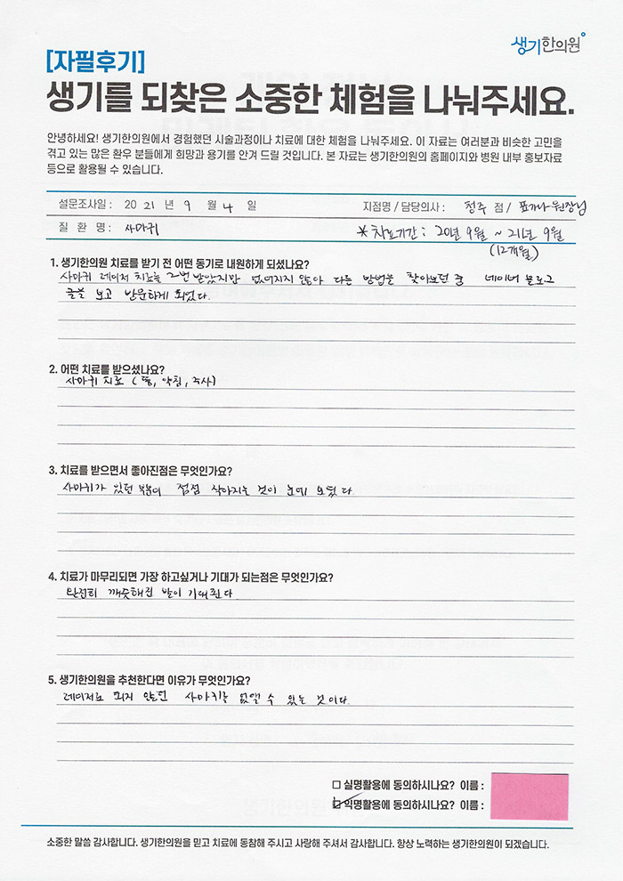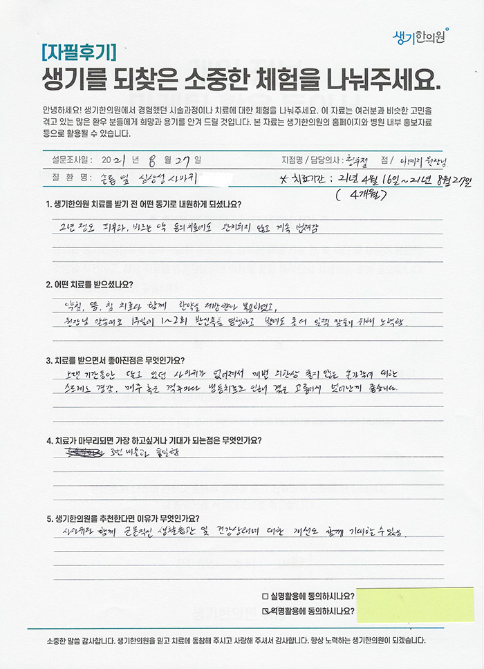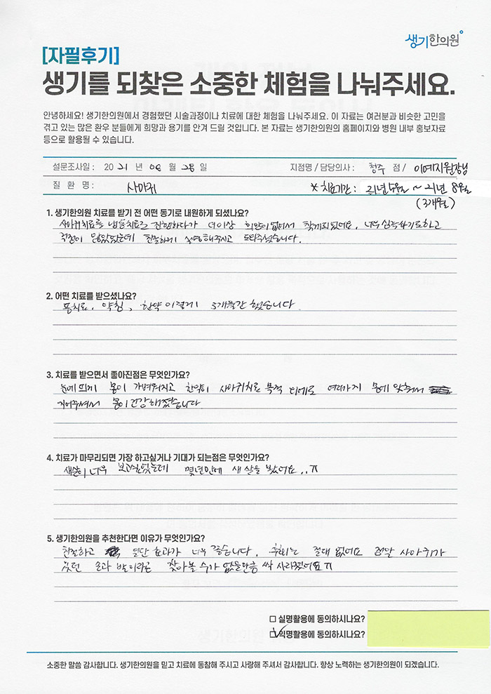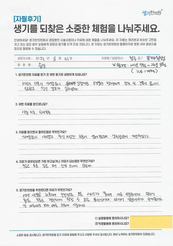 생기한의원과 함께하신 생생한 자필 및 영상 후기를 소개합니다.