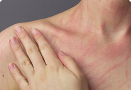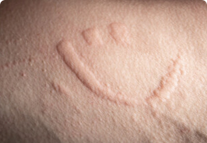 압력을 가한 피부에 국한되어 두드러기와 유사한 부종과 발적 발생